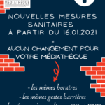 Les horaires de la médiathèque de Routot ne seront pas modifiés suite aux dernières mesures gouvernementales de Couvre-Feu lundi 15h30-18h mardi 10h-12h mercredi 10h-12h et 15h-18h jeudi 15h30-18h vendredi ... Article publié le vendredi 15 janvier 2021