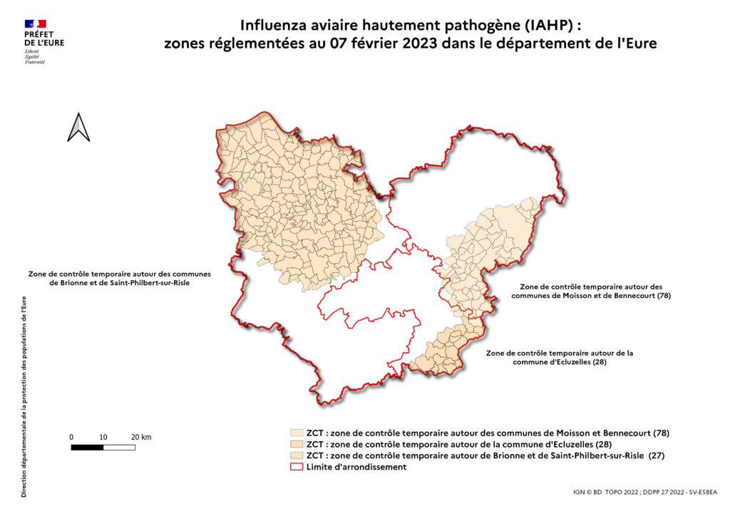 L’évolution de la situation du département est mise à jour au fil de l’eau sur le site internet de la préfecture : https://www.eure.gouv.fr/Actualites/Lutte-contre-l-influenza-aviaire-hautement-pathogene