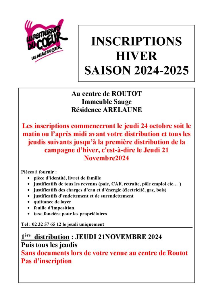 Les inscriptions de la campagne d’hiver de la saison 2024 se dérouleront à l’immeuble Sauge de la Résidence Arelaune à Routot jeudi 24 octobre 2024.