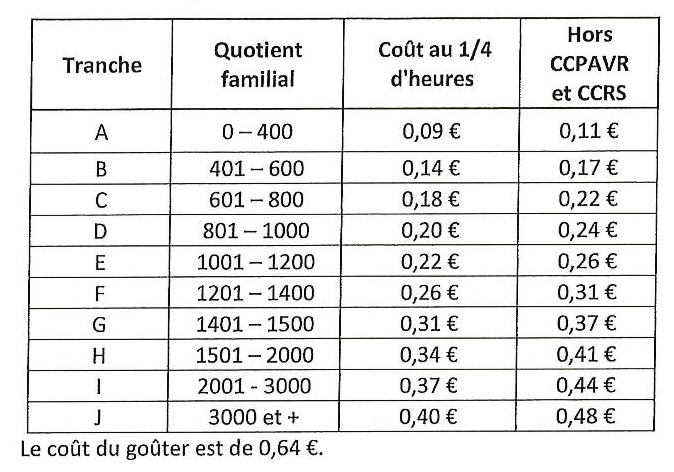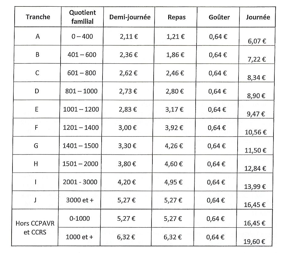 Grille des tarifs au 1er septembre 2025 de l’accueil périscolaire (matin et soir)