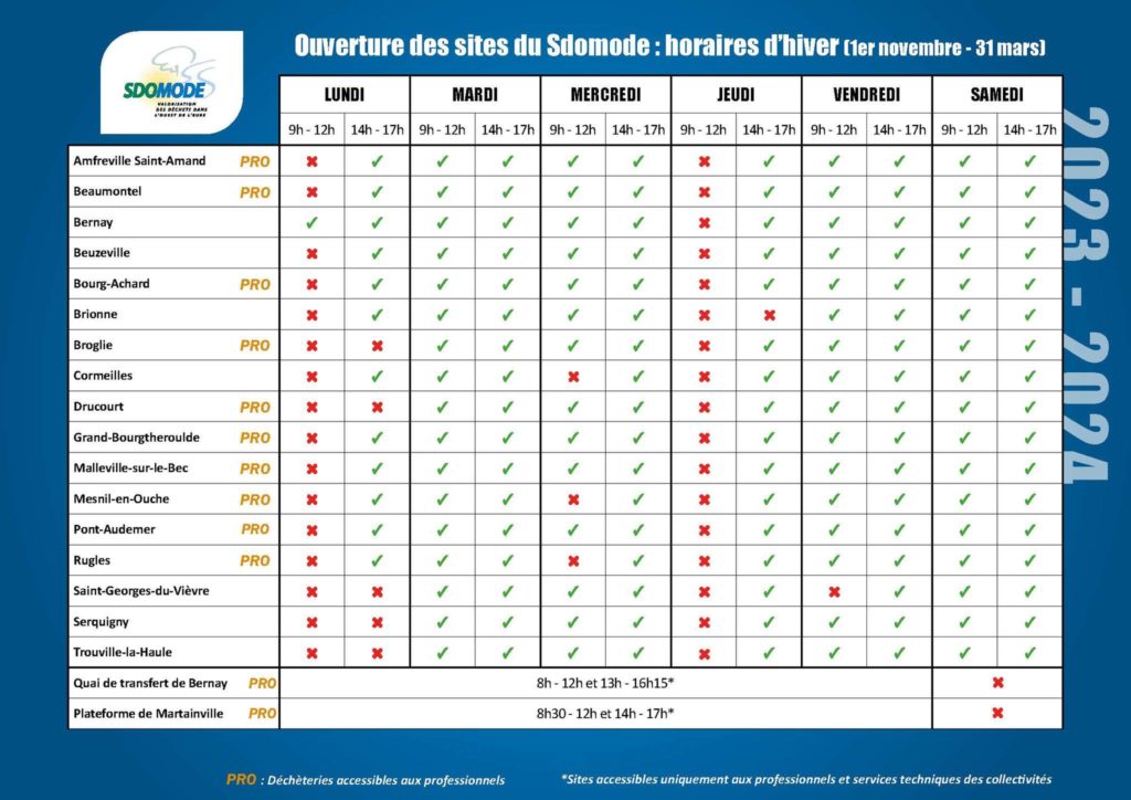 Pour consulter les horaires des déchetteries du territoire, cliquez ici. Attention ! Passage à l’heure d’hiver au 1er novembre 2025